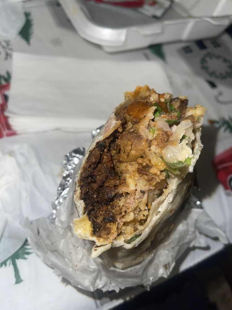 Servido con frijol, huevo, papas y queso Monterey Jack.