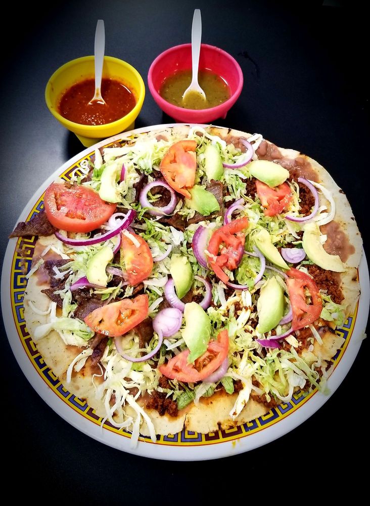 Servido con quesillo oaxaqueno, pinto beans, lechuga, tomate,aguacate, cebolla